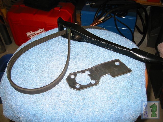 | 12. These are the custom tools I made to deal with the crank-nose issue. At the top is a plain 'ol plumber's strap wrench--except the nylon strap has been replaced with a piece of the old AC/power steering multi-V belt. I used this to hold the auxiliary drive pulley while I loosened and re-torqued the four 6 m/m bolts that hold same to the timing pulley. In the center/left is my hacked up version of the 1990 to1991-1/2 Tech Tool developed by Rick Vatavac at the Central Alabama Miata Society, there's also a 1991-1/2 to 1997 version. | |||