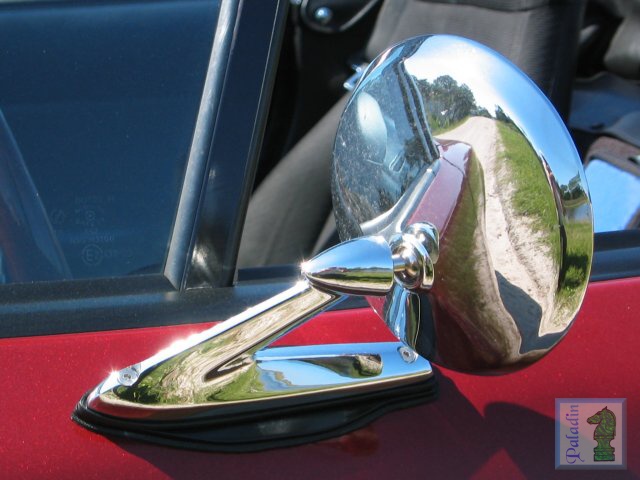 | 22., 23. & 24. Classic Mustang side mirror--get 'em here. My car was repainted by the PO, without removing the side mirrors, so in order to hide the paint line I made some brackets of 1-1/2" x 1/8" aluminum (see pic # 24.) that mimic the OEM mirror mounting foot pattern and extend fore and aft to mount the Mustang mirror. They're a bit small (4" diameter) by current standards, however I found I got used to the driver's side quickly--I put a 4" convex stick-on overlay on the passenger side to get a better view. | |||