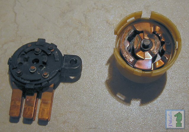 | This is what the innards of my ignition switch looked like when I decided that it was time to do something about having to fiddle with it to get the accessory (radio, etc) power on. 15 minutes, some WD-40, elbow grease, and a brass wire brush, later it was good as new! | |